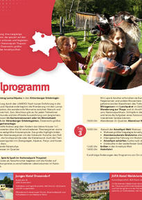 ,,Kräuterelfe Andrea zeigt den Kindern das kleine Kräuter-1x1, Wissenswertes über die 50 verschiedenen Themengärten sowie über die weltgrößte Kräuterspirale. Das große Highlight bildet dabei der Abenteuergarten mit Adrenalin- Rutsche, das Floßfahren, Strohpyramide und Kletterwand. Auch der tierische Bauerngarten mit Zwergziegen, Alpakas, Ponys und Hasen gehört dazu.